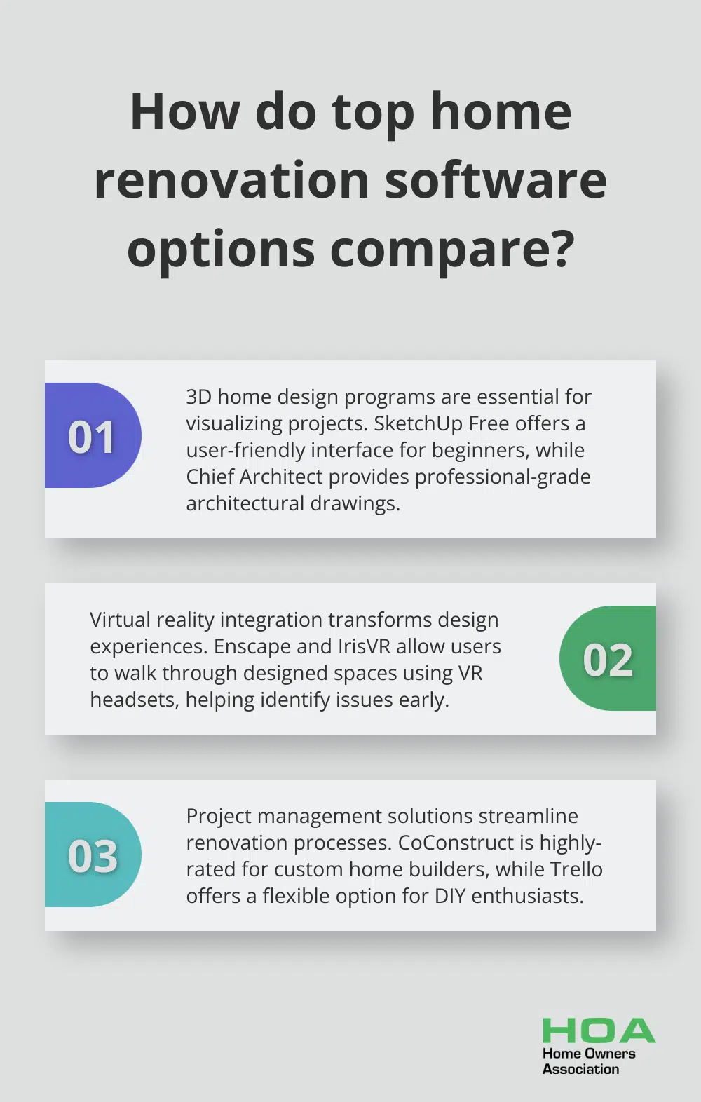 The creation of accurate 3D renderings, cost estimation, and stakeholder collaboration makes home renovation software an essential asset for any project. As technology advances, these tools will become more sophisticated and user-friendly, further simplifying the renovation process. We at Home Owners Association encourage you to explore various digital tools for your next renovation project.