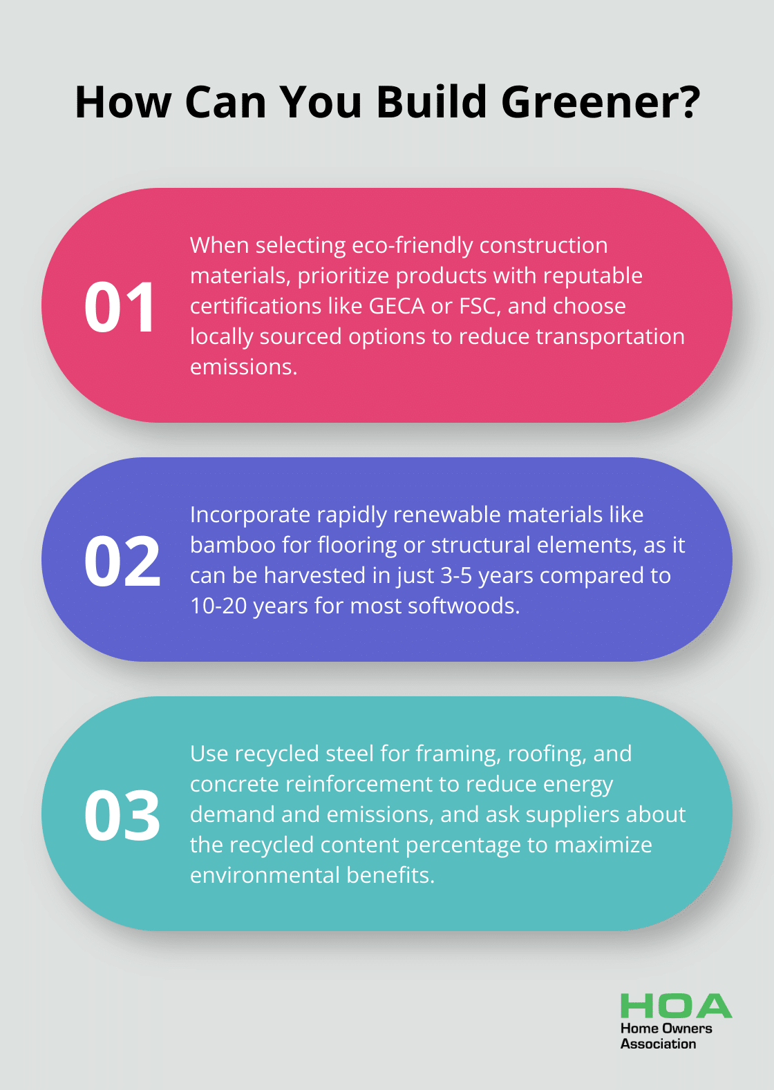 Environmentally conscious homeowners will find that carefully selecting materials based on these criteria can significantly reduce the environmental impact of their construction projects.