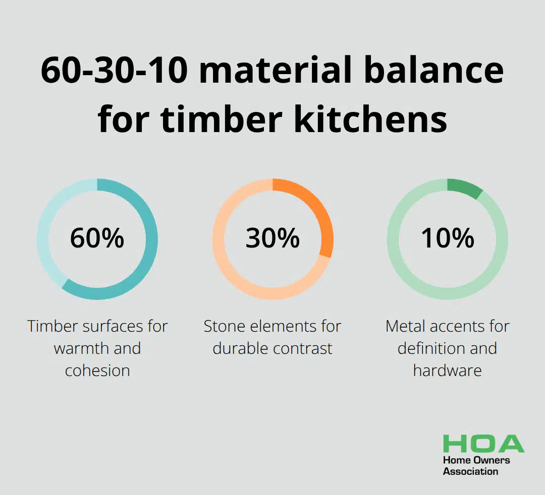Contemporary timber kitchens succeed through strategic material combinations rather than wood-only approaches. Combine walnut cabinets with Carrara marble benchtops and blackened steel hardware for sophisticated contrast. Natural stone splashbacks paired with timber cabinetry create depth without texture competition.
